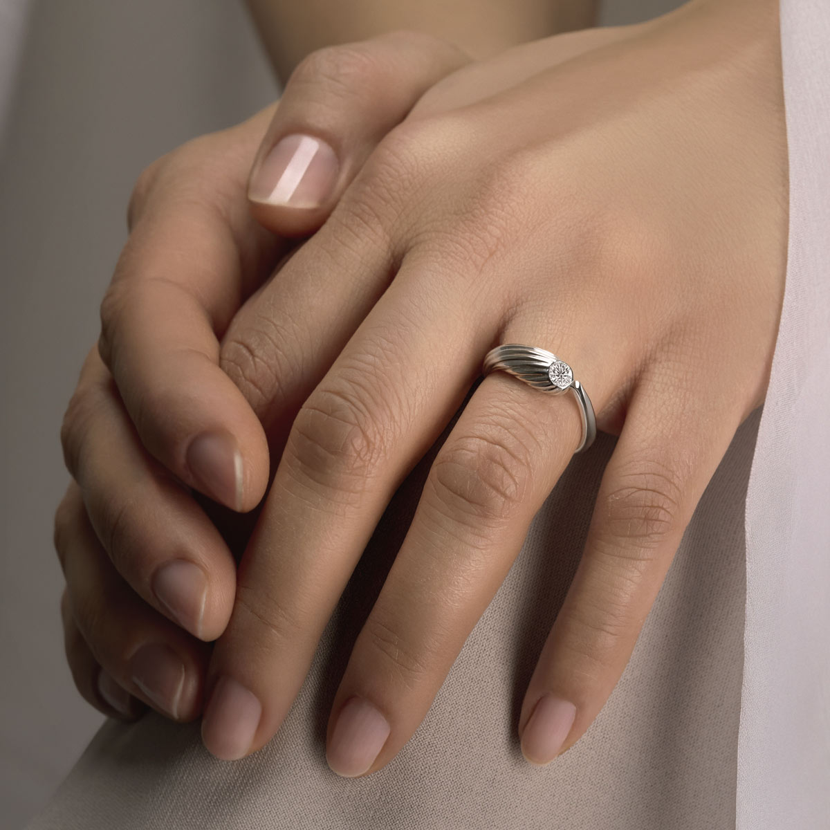 Anello solitario in argento lucido, taglio pulito e linea essenziale. Al centro, un diamante lab a taglio brillante. L’argento fa da contorno alla pietra senza rubarle spazio. E l’anello del “primo sì” che non ha bisogno di orpelli: geometria semplice, bagliore controllato, una promessa che prende luce dall’impegno.